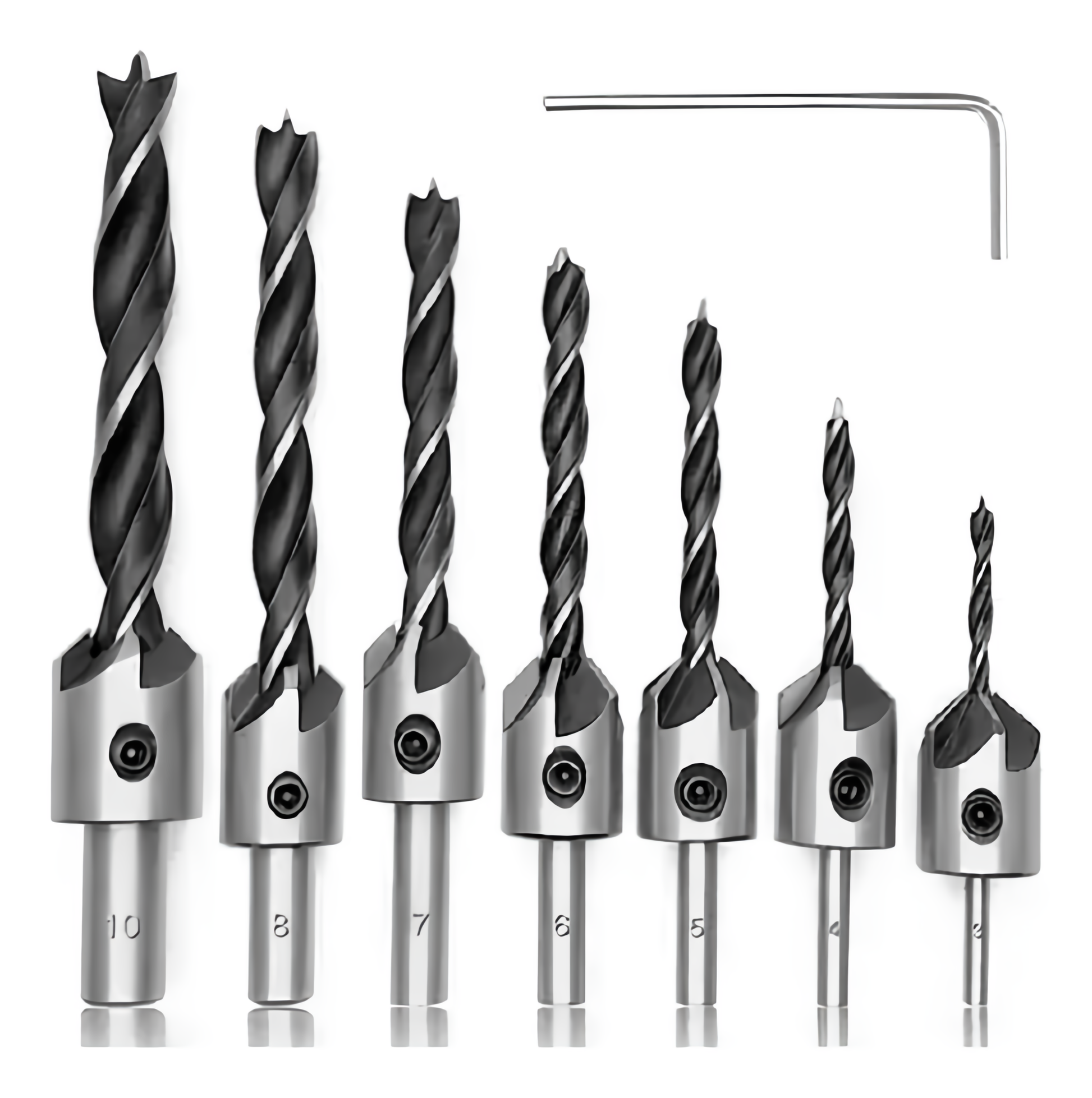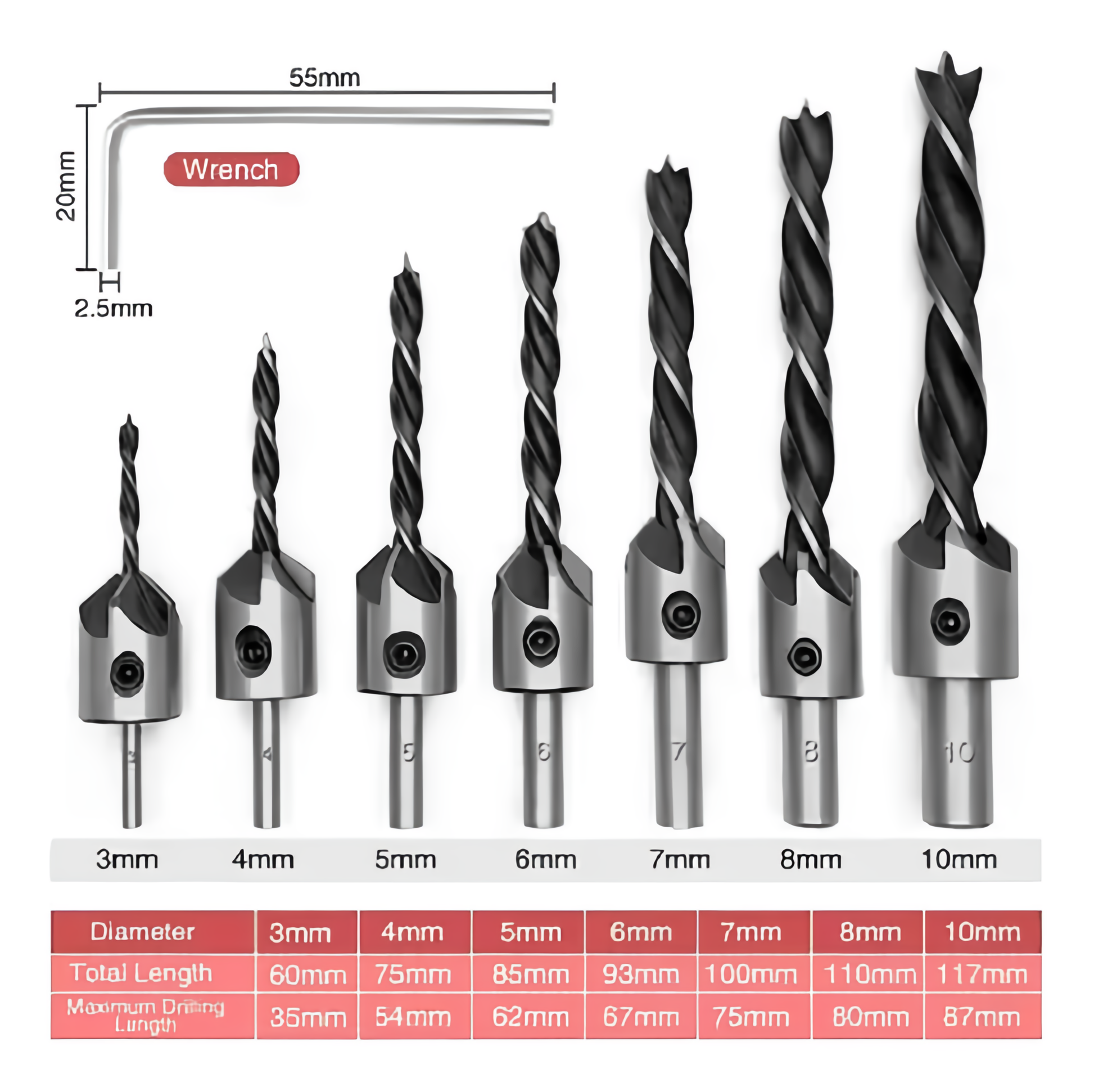 - **7 tamaños diferentes**: el juego incluye 7 brocas avellanadoras en 7 medidas distintas (3mm / 4mm / 5mm / 6mm / 7mm / 8mm / 10mm), con números grabados para una fácil identificación. Así podrás elegir la más adecuada para cada trabajo y obtener resultados óptimos.