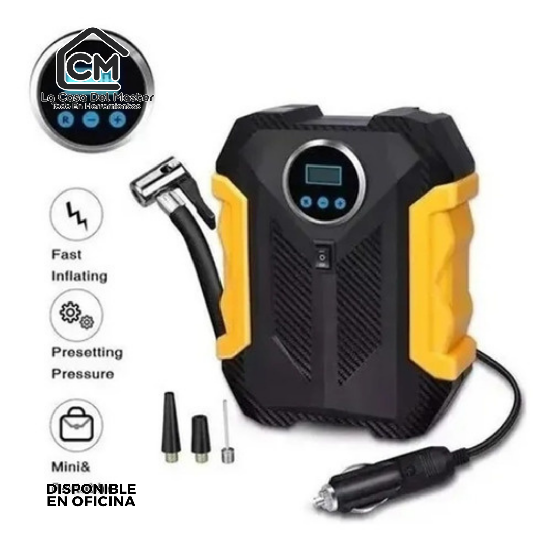 Este compresor de aire es un dispositivo portátil y práctico que se conecta al encendedor de tu auto y te permite inflar los neumáticos de tu vehículo y otros objetos como pelotas, colchones, flotadores y más. Su pantalla digital te muestra la presión de aire actual y te permite preestablecer el valor deseado. Cuando se alcanza el valor establecido, el compresor se detiene automáticamente.