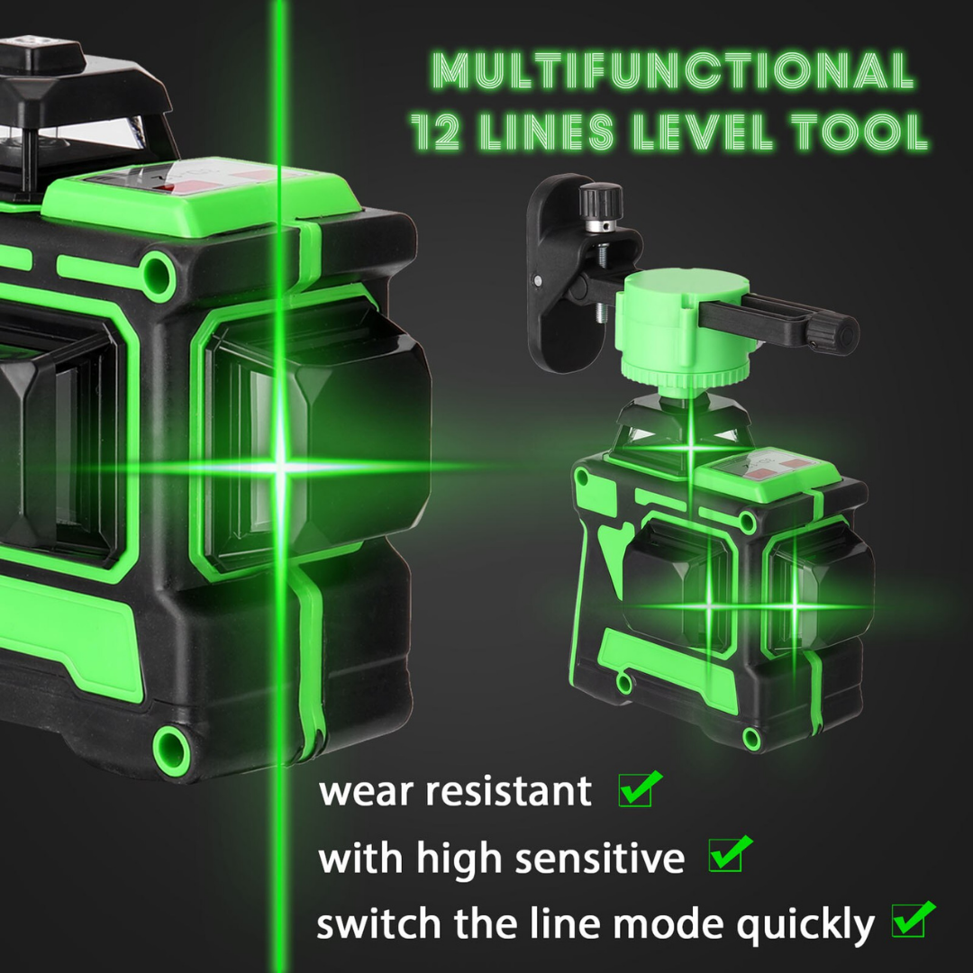 Nivel láser, herramienta de nivelación 3D de 12 líneas, Horizontal y Vertical, nivelado automático, 360, nivel láser verde 2 Baterias