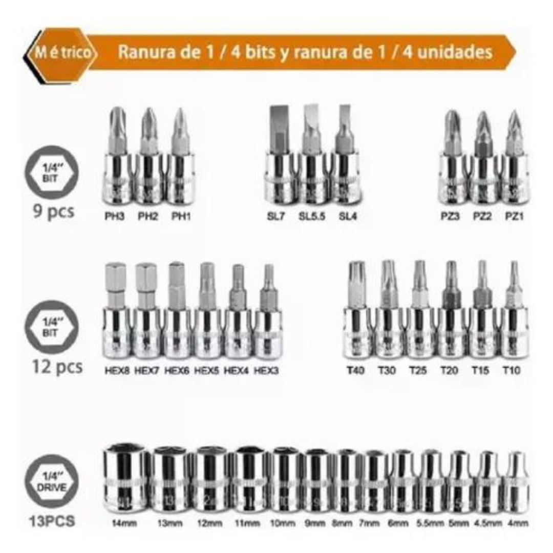 - 13 Dados corto 1/4": 4, 4.5, 5, 5.5, 6, 7, 8, 9,10, 11, 12, 13 y 14mm.