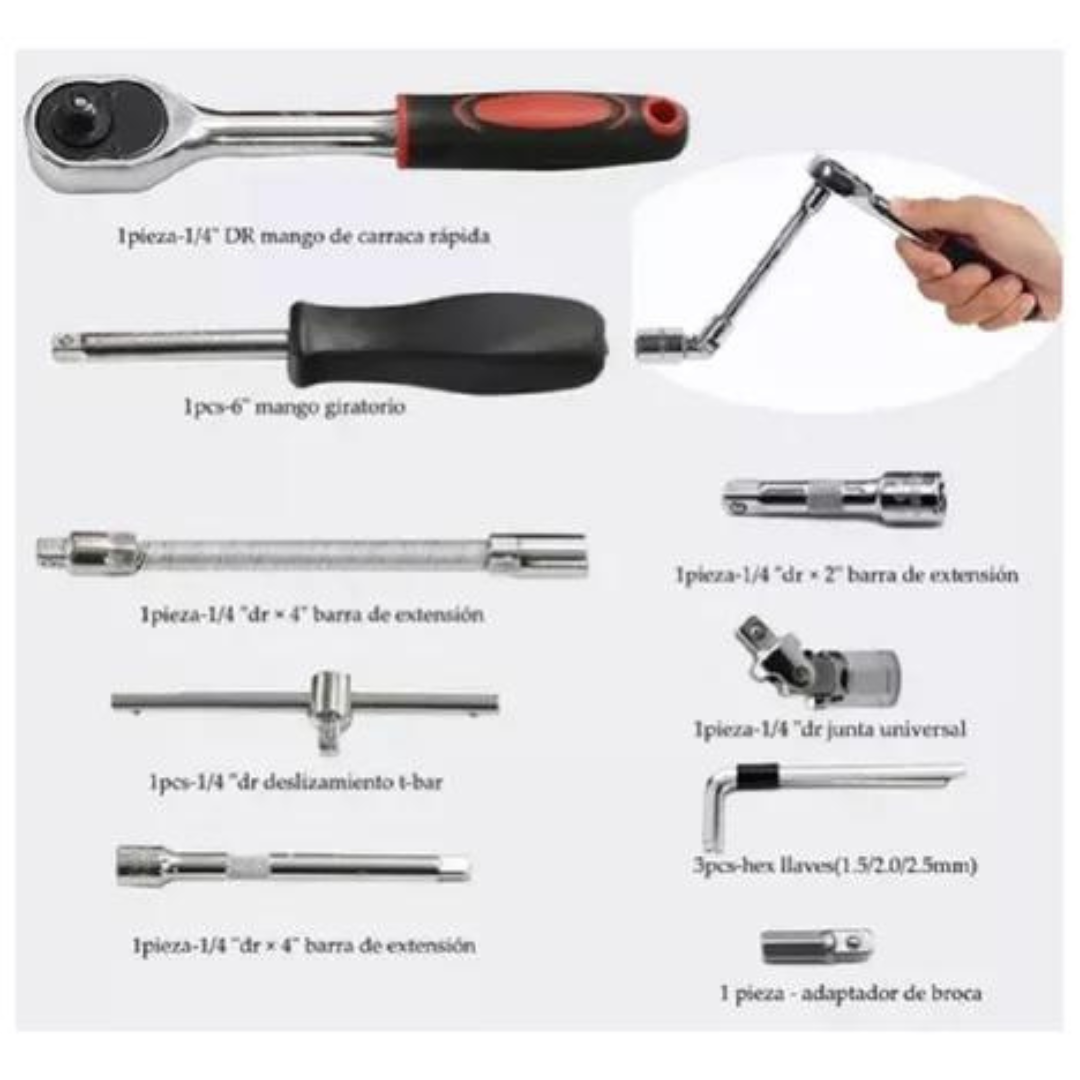 Nuestro Juego De Herramientas Mecánicas Dados Llaves Acero 46 Pcs incluye un cuadrante de 1/4" (pulgada), dados hexagonales y milimétricos, material de cromo vanadio y una caja de almacenamiento plástica. El contenido incluye 6 dados allen, 6 dados Torx, 9 dados atornillador, 3 llaves allen, 1 extensión corta, 1 extensión larga, 1 extensión flexible, 1 barrote corredizo, 1 adaptador, 1 dado flexible, 1 chicharra de 1/4", 13 dados cortos 1/4”, 1 atornillador y 1 caja de almacenamiento.