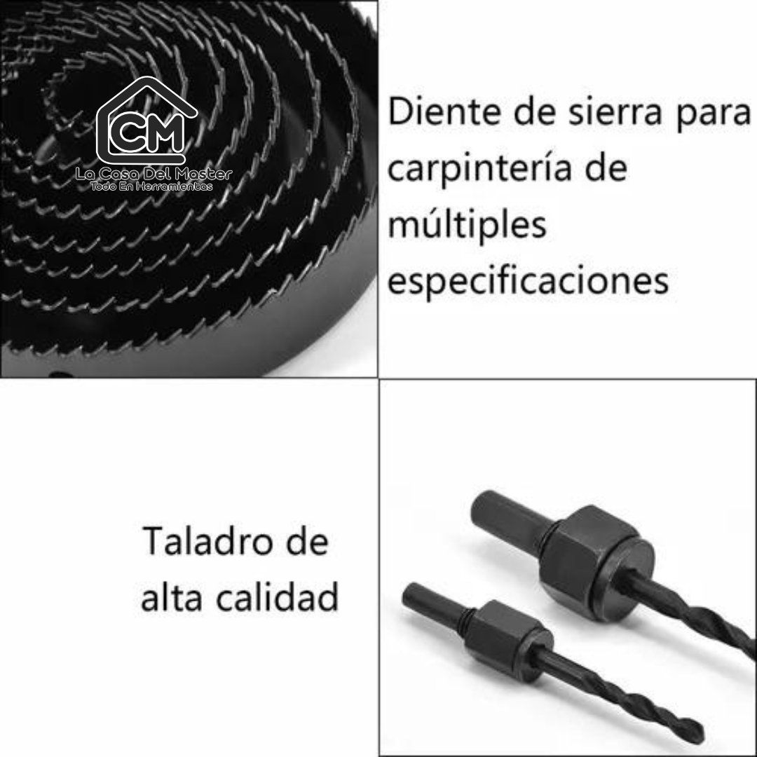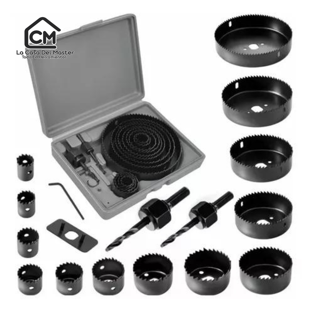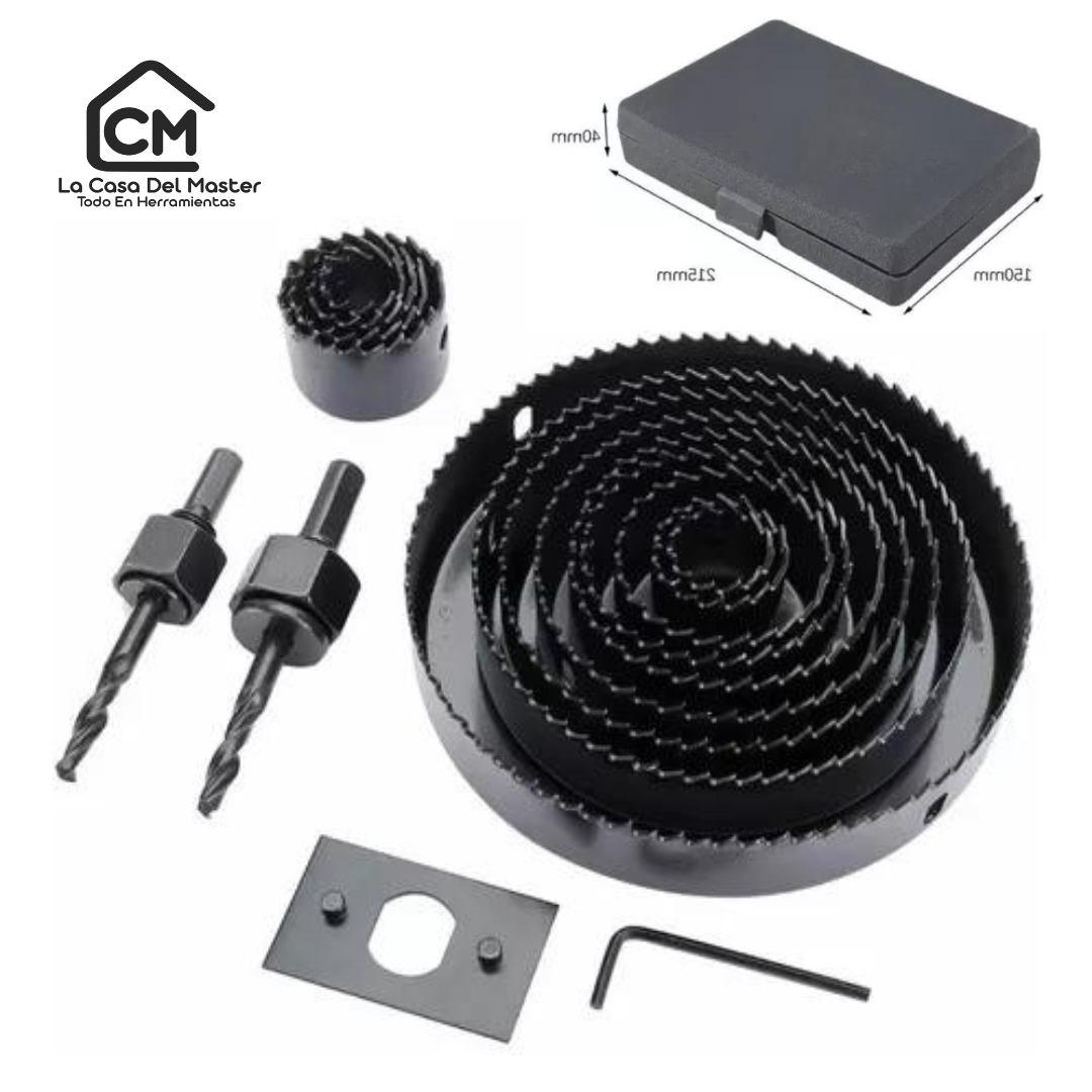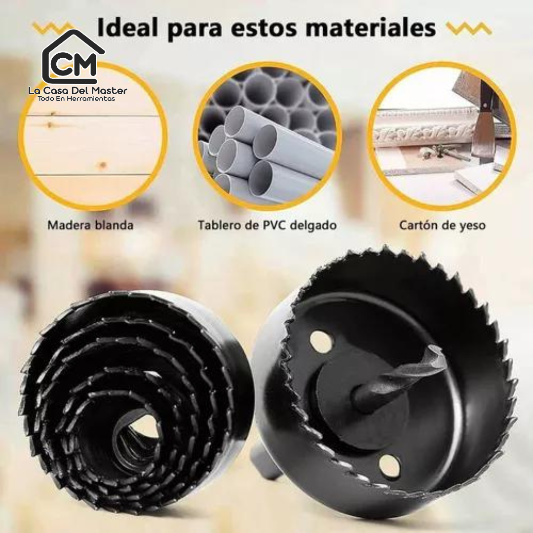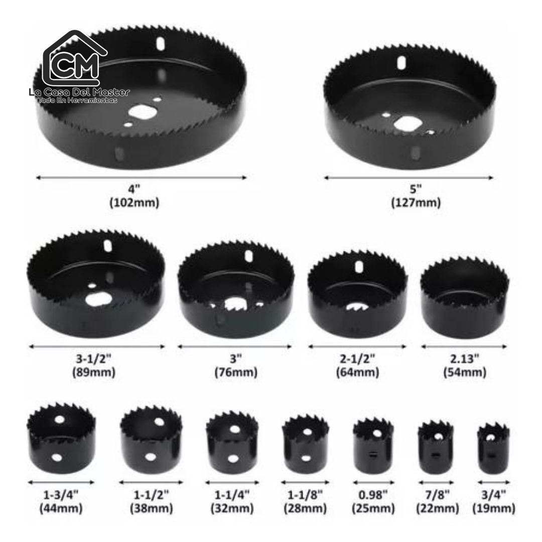 - 12 sierras copa de acero con alto contenido de carbono, con medidas que van desde 19 a 127 mm, ideales para cortar materiales blandos con precisión y rapidez.
