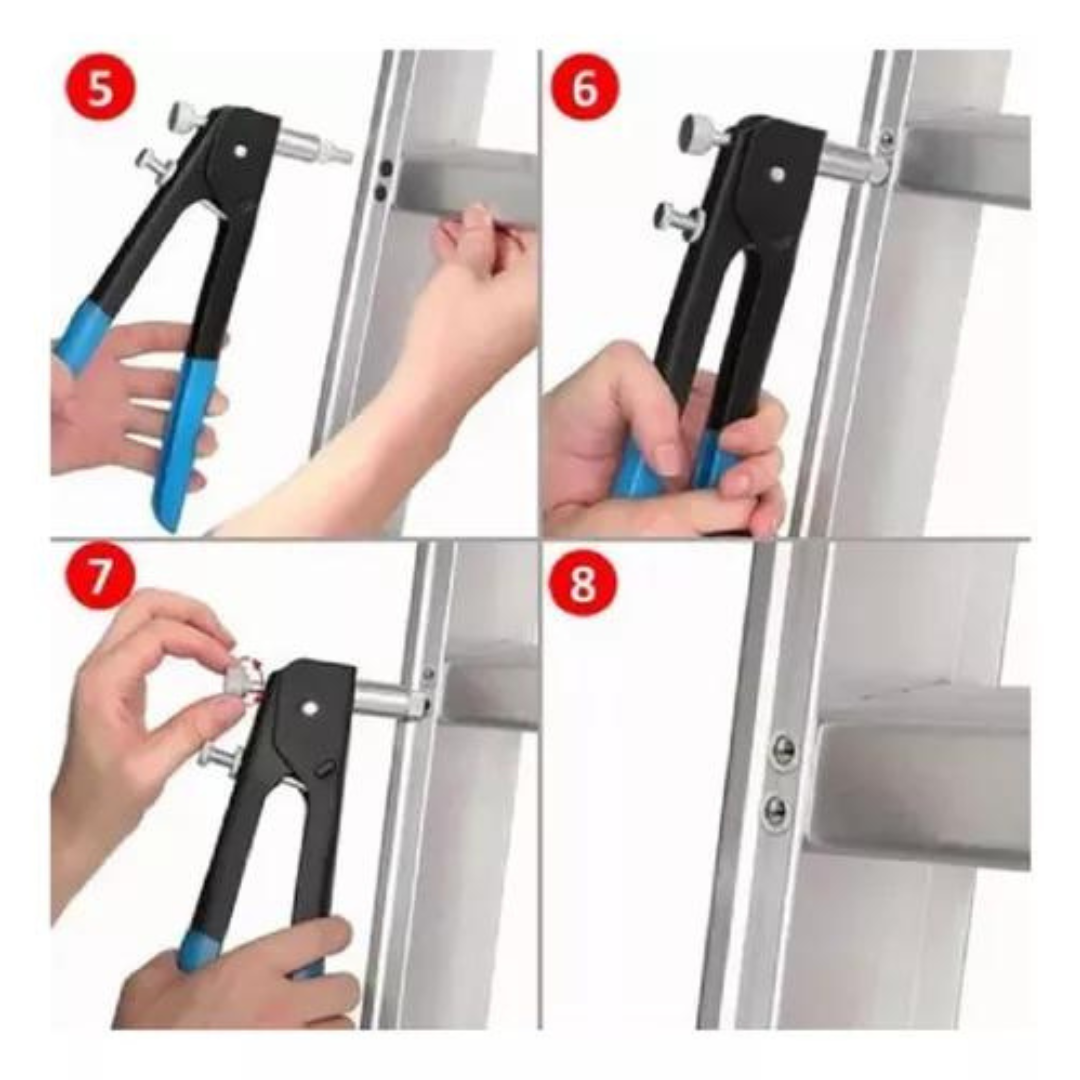La remachadora es fácil de usar y se puede manejar con una mano. Simplemente seleccione el porta brocas correcto para el tamaño de tuerca remachadora que está utilizando, inserte la tuerca remachadora en el porta brocas y luego coloque la pistola remachadora sobre el orificio donde desea instalar la tuerca remachadora. Apriete los mangos de la remachadora para colocar la tuerca remachadora.
