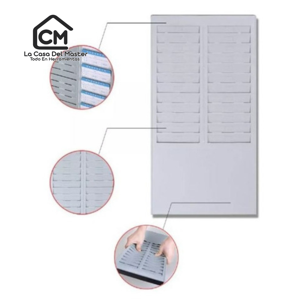 Este tarjetero es un dispositivo que te permite distribuir y visualizar las tarjetas de registro de personal de forma sencilla y organizada. Su estructura es de plástico resistente y tiene 24 ranuras para colocar las tarjetas. Cada ranura tiene una etiqueta para escribir el nombre o el número de la persona.